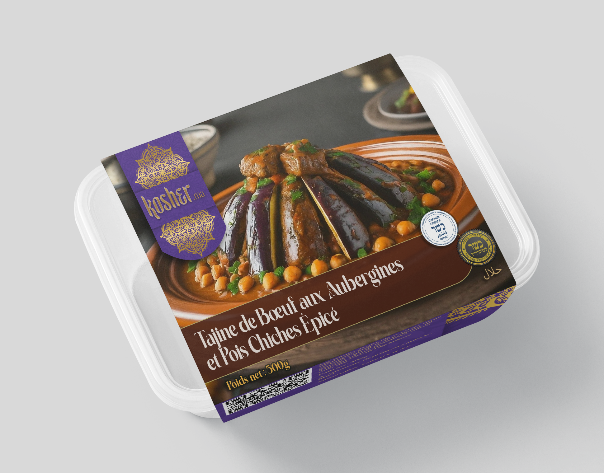 Notre tajine de bœuf aux aubergines et pois chiches épicés est une création gourmande qui célèbre les saveurs authentiques de la cuisine marocaine. Des morceaux choisis de bœuf, mijotés jusqu'à parfaite tendreté, se marient harmonieusement avec des aubergines fondantes et des pois chiches moelleux. Les aubergines, légèrement grillées avant d'être incorporées au tajine, développent des notes fumées qui se mêlent subtilement à la richesse de la viande. Les pois chiches, longuement mijotés, apportent leur texture crémeuse et leur caractère nourrissant. La sauce généreusement épicée, relevée de cumin, paprika et harissa délicate, enveloppe l'ensemble d'une chaleur réconfortante sans excès. Ce plat équilibré incarne la générosité de la cuisine marocaine traditionnelle : savoureux, consistant et parfaitement assaisonné, il offre une expérience gustative complète où chaque ingrédient trouve sa place.